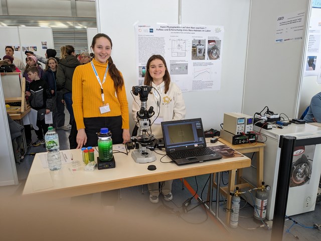 In Kooperation mit dem Schülerforschungszentrum Eningen hat unsere Schülerin Ana-Maria Toma das potenzielle Terraforming des Mars untersucht. Mit ihrer Forschungspartnerin Anthea Leipold gewann sie beim „Jugend forscht“-Regionalwettbewerb den zweiten Preis im Fachgebiet „Geo- und Raumwissenschaften“. Beim Schnuppern im Schülerforschungszentrum (SfZ) hatte Ana schon den Wunsch geäußert, „etwas mit Raumfahrt“ zu erforschen. Im Team mit Anthea entwickelte sie ihre Versuchsapparaturen und Forschungsansätze, unterstützt von ihrem Betreuer Herr Nisch vom SfZ und mit Tipps von Herrn Weitbrecht am KvFG. Die Ausstattung des SfZ ermöglicht Forschung im Vakuum und bei tiefen Temperaturen - also bei weltraumähnlichen Bedingungen. In kleinen luftdichten Versuchskästen mit kontrollierter Marsatmosphäre, Marsboden und Marstemperaturen wurden verschiedene Grünalgen auf ihre Eignung als Sauerstofflieferanten für ein Terraforming getestet. Die Versuchsergebnisse kann man auf dem Plakat im KvFG nachlesen. Auf der „Jugend forscht“-Veranstaltung nahm ein Professor der Universität Stuttgart mit den beiden Schülerinnen Kontakt auf - er forscht im gleichen Gebiet und hat sie nun in sein Labor eingeladen.