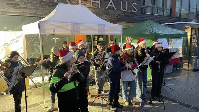 Eine Schülergruppe aus der Bigband des Karl-von-Frisch-Gymnasiums stellte sich den eisigen Temperaturen und beglückte durch ihr Spiel zahlreiche Besucher des Weihnachtsmarktes in Dußlingen. Erst nach zahlreichen Zugaben wurden sie zum wärmenden Punsch entlassen. Der Auftritt der Bigband vor dem Dußlinger Rathaus am Samstag, 2.12.2023 war zuvor sogar auf der Titelseite des Gemeindeboten Dußlingen angekündigt worden.