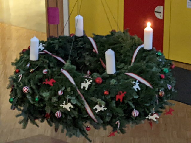 Einige Lehrkräfte haben am Freitagabend vor dem ersten Advent in der Aula den diesjährigen Adventskranz gebunden, der nun über die Adventszeit wieder in unserer Aula thront. Morgens, wenn es draußen noch dunkel ist, aber schon die erste Kerze brennt, verleiht das Kerzenlicht unserer Schule eine ganz besondere Atmosphäre. Herzlichen Dank allen Mitwirkenden für den prachtvollen Adventskranz!