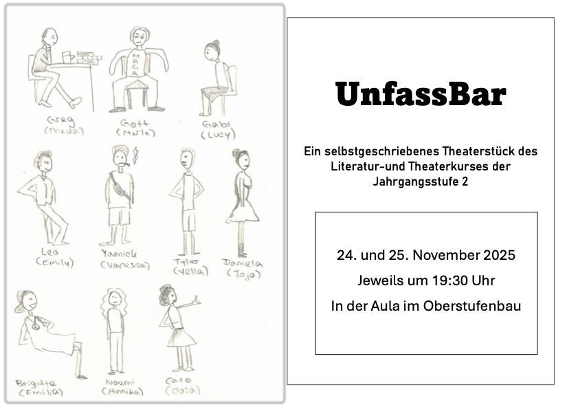 Am 24. und 25. November 2025 kommt das Theaterstück „UnfassBar“ auf die Bühne! Wir vom Literatur-und Theaterkurs der Jahrgangsstufe 2 haben das Stück selbst mit viel Engagement zusammen geschrieben und geprobt. Herausgekommen ist ein turbulentes Werk mit so mancher eigensinniger Figur. Wollen Sie selbst herausfinden, was Greg und Brigitte zum alten Fritz Nietzsche sagen, wie Caro eine sexisitische Welt erlebt, wer eigentlich dieser Yannick ist und wie Luca sich um die „UnfassBar“ kümmert? Dann laden wir Sie herzlich ein, jeweils um 19:30 Uhr zu unseren Aufführungen in die Aula im Neubau zu kommen. Wir freuen uns auf Sie! - Theda Braun, Jg.2
