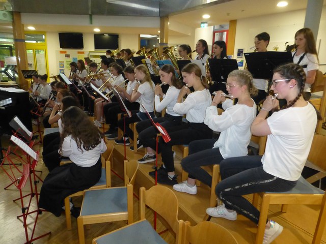 Im Mai war es endlich wieder möglich: 140 KvFG-Schülerinnen und -Schüler präsentierten ihr Können an ihren Blasinstrumenten. Dabei ergab sich ein beeindruckendes crescendierendes Programm mit fulminantem Finale von der Bläserklasse 5, den Bläserklassen 6, 7 und 8 bis hin zur Bigband der Mittel- und Oberstufe, die abschließend in einem 60-köpfigen Orchester gemeinsam mit der Juniorbigband und der Bläserklasse 8 unter der Leitung von Frau Braun noch Hits aus „Aladdin“ präsentierte.