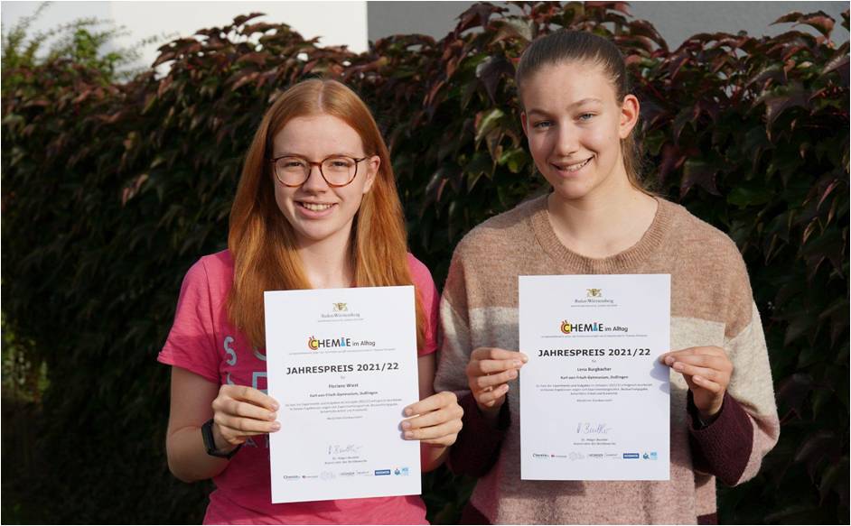 Lena Burgbacher und Floriane Wiest aus der Jahrgangsstufe 1 sind unter den Jahrespreisträgerinnen des Landeswettbewerbs “Chemie im Alltag” 2021/22. Betreut wurden die beiden Schülerinnen von Frau Schmidt. Der Wettbewerb unter der Schirmherrschaft der Kultusministerin Theresa Schopper befasst sich mit spannenden Experimenten und Phänomenen der Chemie. Er teilt sich in zwei Runden auf, in denen jeweils eine Hausarbeit mit Versuchen, Protokollen und Erklärungen der beobachteten chemischen Reaktionen angefertigt werden muss. In diesem Jahr ging es unter anderem um das Volumen des Kohlenstoffdioxidgases, das beim Kontakt einer Brausetablette mit Wasser in Abhängigkeit von Wassertyp und Temperatur frei wird. Die Preisverleihung fand am 19. Oktober 2022 in der Experimenta in Heilbronn statt. Dort konnten die Preisträgerinnen zunächst die aktuelle Ausstellung anschauen, das 360°-Kino „Science-Dome“ bewundern und dann in einem Labor-Workshop eine eigene Brennstoffzelle in Betrieb nehmen. Als Höhepunkt des Tages wurden die Jahrespreise verliehen. Neben einer Urkunde gab es Sachpreise wie Experimentierkästen und persönliche Laborausstattung. Wir gratulieren herzlich!