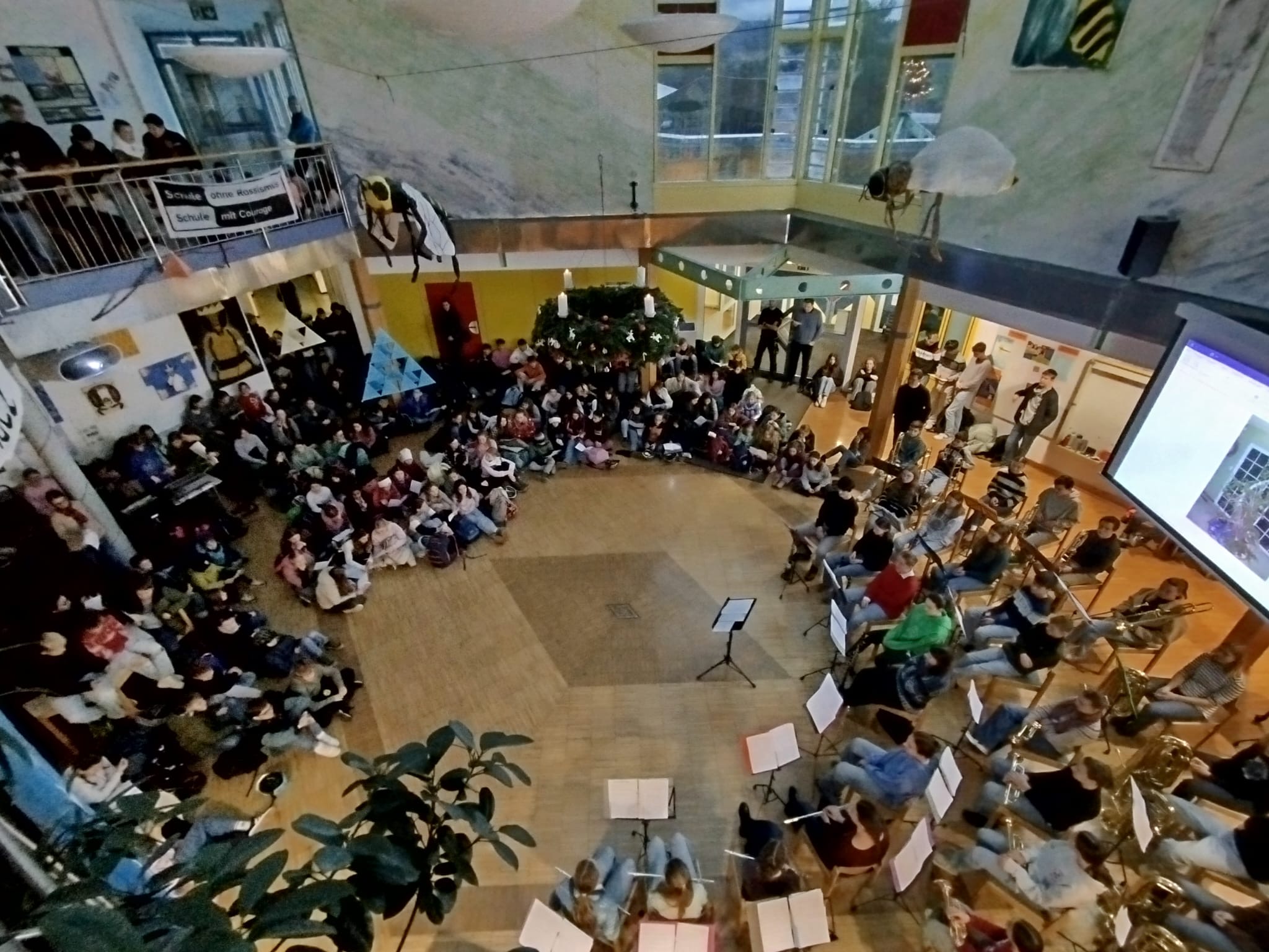 Der letzte Schultag vor den Ferien begann mit einem besinnlichen Gottesdienst, gestaltet von den Kolleginnen und Kollegen der Reli-Fachschaft, Frau Weißgerber- Rösch, Frau Klöss und Herrn Lacher. Stimmungsvoll umrahmt wurde die Veranstaltung von der KvFG-Bigband unter der Leitung von Herrn Wolf, die sowohl klassische Advents- und Weihnachtslieder als auch moderne Weihnachtshits vortrugen. Nahezu alle Klassenstufen beteiligten sich an der Gestaltung des Gottesdienst, sei es durch Wortbeiträge oder bei der musikalischen Gestaltung und sorgte dafür, dass richtige Weihnachtsstimmung aufkam und sich dadurch die Vorfreude auf die Feiertage und Ferien noch vergrößerte. Der gesamten Schulgemeinschaft frohe Weihnachten und einen guten Rutsch. Bis 2025!