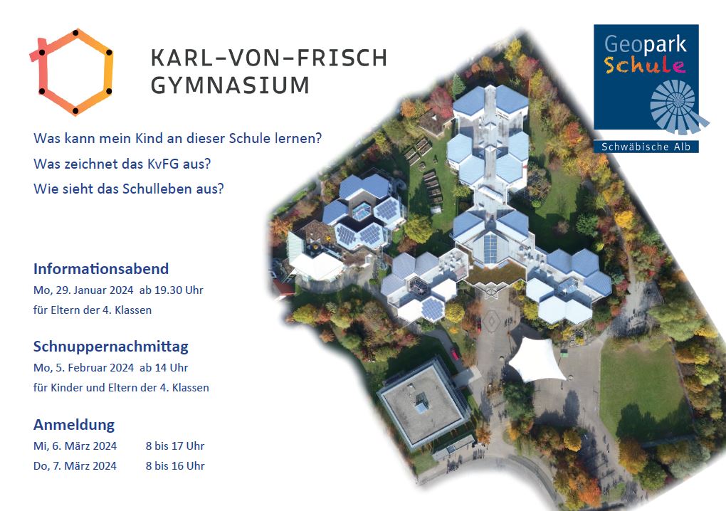 Wir haben wieder eine Informationsbroschüre übers Karl-von-Frisch-Gymnasium zusammengestellt, die Eltern von Viertklässlerinnen und Viertklässlern Orientierung geben soll und über unser Gymnasium informiert. Weitere Informationsmöglichkeiten bestehen beim Elternabend am Mo, 29.1.2024, um 19.30 in der KvFG-Aula sowie beim Schnuppernachmittag am Mo, 5.2.2024, um 14.00 Uhr. An diesem Nachmittag dürfen die Schülerinnen und Schüler aus den Klassen 4 im Unterricht schnuppern, während die Eltern sich über das KvFG informieren können. Herzliche Einladung!
