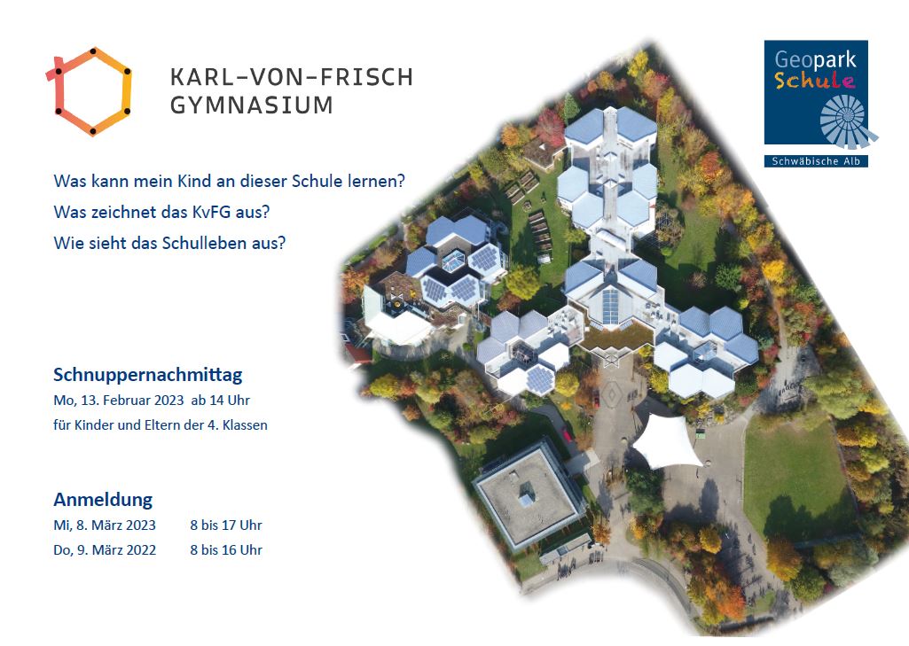 In der neu gestalteten Informationsbroschüre übers Karl-von-Frisch-Gymnasium finden insbesondere Eltern der Viertklässlerinnen und Viertklässler Antworten unter anderem auf die folgenden Fragen: Was kann mein Kind am KvFG lernen? Was zeichnet das KvFG aus? Wie sieht das Schulleben aus? Bitte informieren Sie sich!