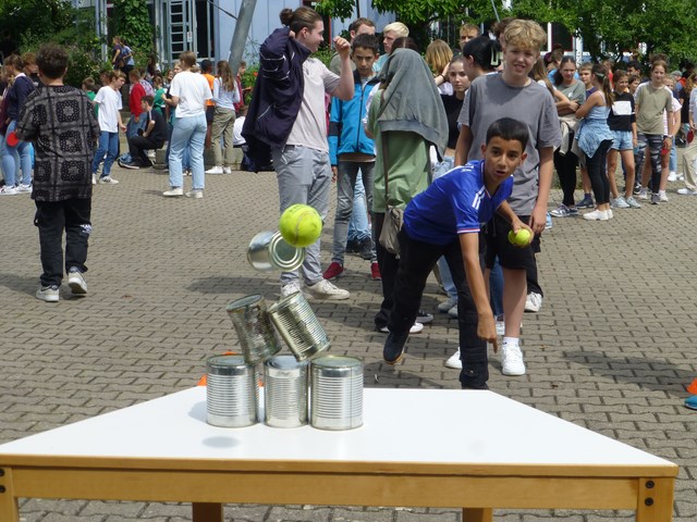 Die Sportfachschaft hat sich fürs Schuljahresende etwas ganz Besonderes überlegt: ein Tischtennisturnier aller Stufen, von Klasse 5 bis 11, in altersgemischten Gruppen. Dieses fand am vorletzten Schultag, dem 25.7.2023, von der 4. bis zur 6. Stunde statt. Herr Divljak und Herr Renz organisierten ein Mäxle-Turnier an sechs Platten, das großen Anklang fand und den Austausch über Klassengrenzen hinweg förderte. Die Sieger wurden am selben Nachmittag auf dem Schulfest geehrt. Parallel für die gerade nicht Tischtennis spielenden Schülerinnen und Schüler gab es Stationen zum Zielwurf an den Basketballkörben auf dem Schulhof oder Dosenwerfen (vgl. Foto). Danke an die Organisatoren für das gelungene Turnier zum Schuljahresabschluss!