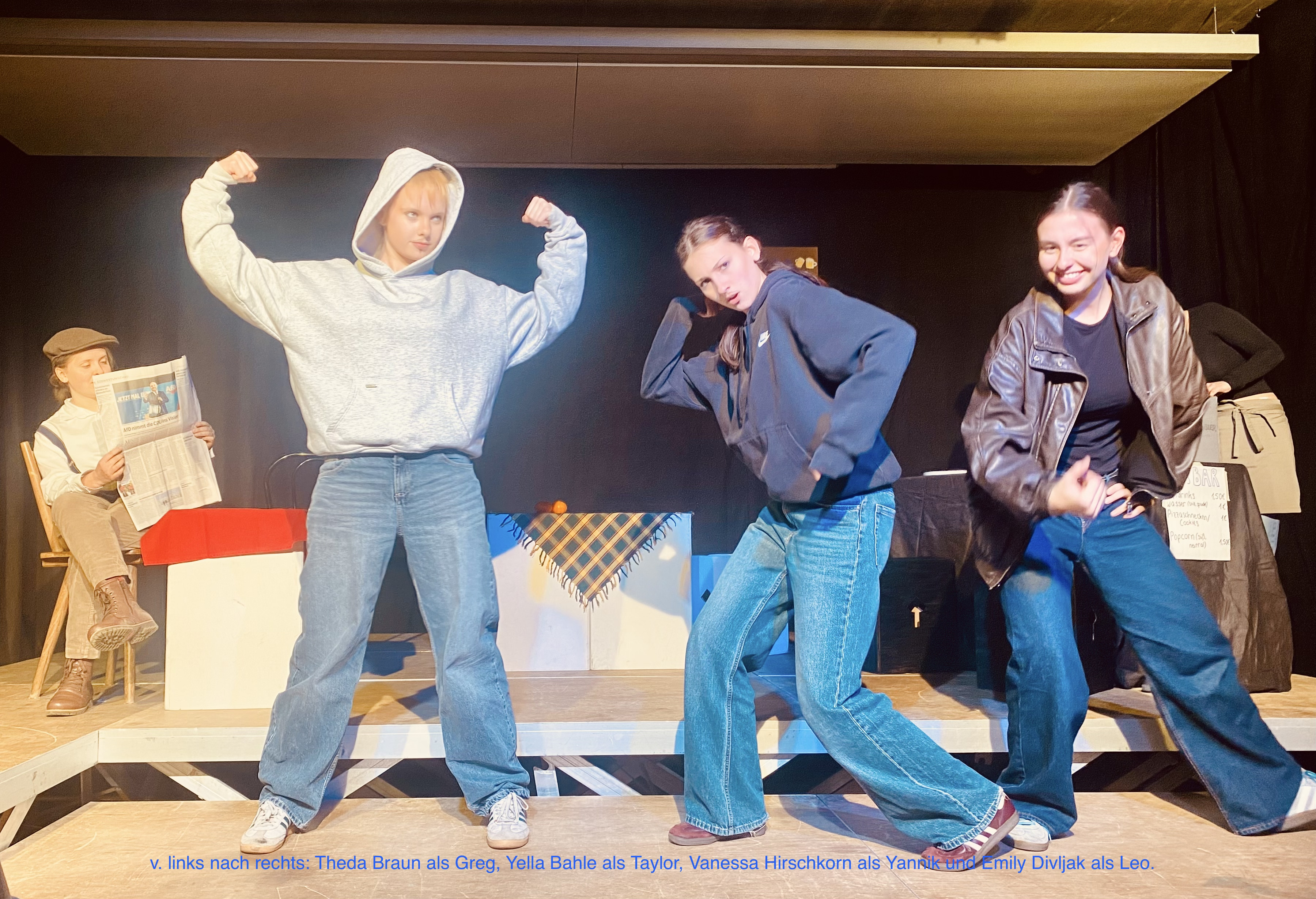 Gestern feierte das selbst entwickelte Stück „UnfassBar“ des Literatur- und Theaterkurses der Jahrgangsstufe 2 unter der Leitung von Frau Heyeckhaus-Porsch Premiere, heute Abend folgt eine weitere Vorstellung. Dass die Aufführung zeitlich auf den Orange Day am 25. November fällt, der weltweit auf Gewalt gegen Frauen aufmerksam macht, unterstreicht die gesellschaftliche Relevanz der Themen, die das Stück prägen: Rollenbilder, Erwartungen und zwischenmenschliche Dynamiken; auch wenn das Stück unabhängig davon entstanden ist. In der als Kneipe gestalteten Szenerie treffen unterschiedliche Figuren immer wieder aufeinander, und Konflikte, Freundschaften, Liebesanbahnungen, aber auch Gewalt und schwierige Familienhierarchien treten deutlich zutage. Da der Kurs ausschließlich aus Schülerinnen besteht, die natürlich auch die männlichen Rollen übernehmen, entfaltet sich die Wirkung eben auch der männlichen Figuren umso eindrücklicher. Das Publikum erlebte einen Abend, der zwischen humorvollen Momenten und nachdenklichen Szenen wechselte. Unterstützt von passender Musik entstand ein lebendiger Theaterabend, bei dem das Engagement und die Spielfreude der Schülerinnen deutlich spürbar wurden. Wer neugierig geworden ist, sollte sich die heutige Vorstellung um 19.30 Uhr in der Aula im Neubau nicht entgehen lassen.