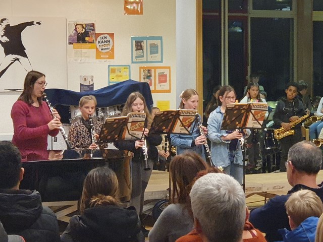 Über 40 Schülerinnen und Schüler lernen am KvFG im Rahmen der Bläserklassen ein Holzblasinstrument. Sie präsentierten am 19.12.2023 unterm Adventskranz in der KvFG-Aula den zahlreich erschienenen Gästen und stolzen Eltern ihre Fortschritte. Besonders beeindruckend ist dabei immer wieder das Spiel der Fünftklässler, die ihr Instrument erst seit drei Monaten lernen. Vielen Dank an Frau Hahn (Querflöte), Frau Kuhn (Klarinette) und Herrn Koch (Klarinette und Saxophon) von der Jugendmusikschule Steinlach für ihre Arbeit mit unseren jungen Musikern.