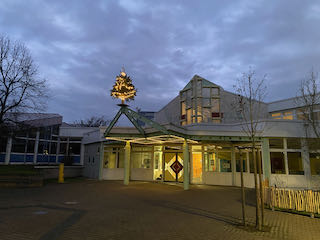Seit letztem Freitag schmücken Lichterketten und Weihnachtsbaum den Eingangsbereich des KvFG und verbreiten eine vorweihnachtliche Atmosphäre. Dieser stimmungsvolle Eindruck wird durch den von einigen Lehrkräften gestaltete Adventskranz, der mitten in der Aula hängt, noch weiter verstärkt. Auch wenn das Kerzenlicht dieses Jahr nur von LED-Kerzen gespendet wird, zeigt es doch den Beginn dieser besonderen Zeit im Jahr an. Wir wünschen allen eine fröhliche und schöne Adventszeit.