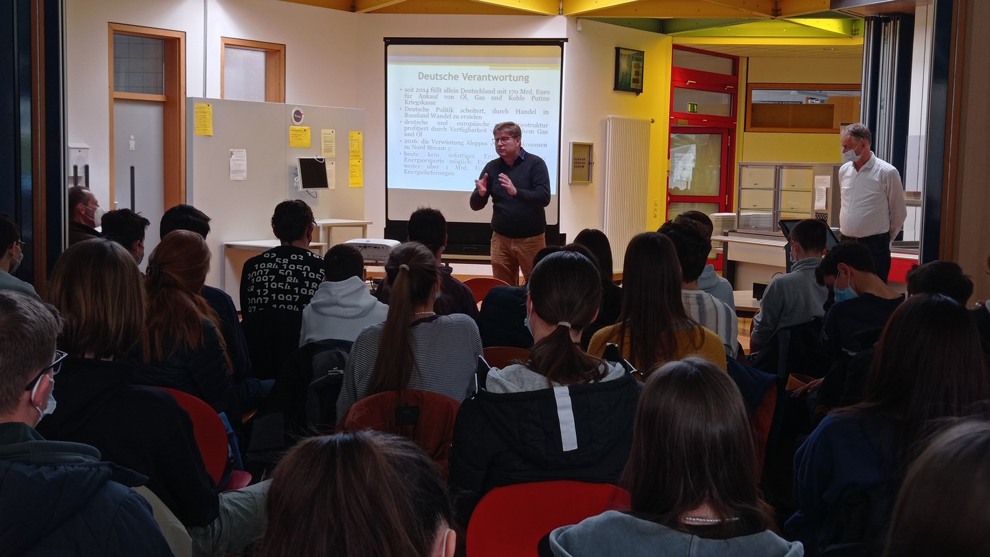 Am Freitag, den 18. März, hielt Prof. Dr. Klaus Gestwa, Leiter des Instituts für osteuropäische Geschichte der Universität Tübingen, einen Vortrag zum Thema Putin und die Ukraine für die Klassenstufe 10 und die Jahrgangsstufe 1. Das Zustandekommen dieses Vortrags geht auf die Initiative einer ehemaligen KvFG-Schülerin, Lorena Popović (Abitur 2012), zurück, die mittlerweile bei Prof. Gestwa promoviert.