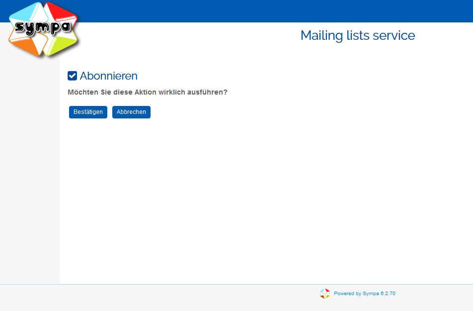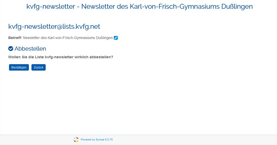 - Bestätigen Sie die Frage „Wollen Sie die Liste kvfg-newsletter wirklich abbestellen?“ durch einen Klick auf „Bestätigen“.