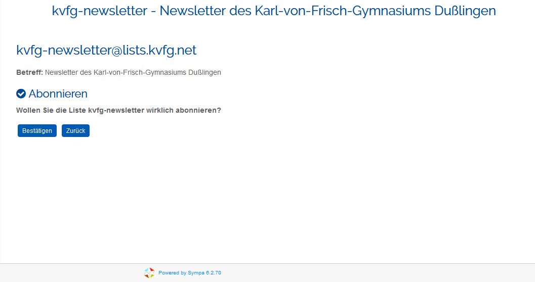 Der KvFG-Newsletter ist der Informationsdienst des Karl-von-Frisch-Gymnasiums. Sie bekommen über diese Mailingliste Einladungen zu aktuellen Veranstaltungen sowie Informationen zu diversen schulischen Themen.