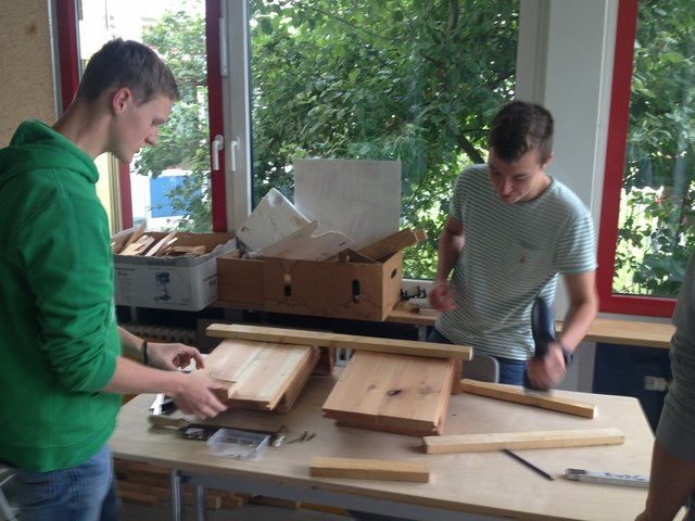 An den E-Days im Herbst 2014, im Herbst 2015 und im Juni 2015 wurden von Schülerinnen und Schülern Fledermaus-Flachkästen aus unbehandeltem Holz abgemessen, zugesägt und montiert und im Juni 2015 am Schulgebäude in katzensicherer Höhe aufgehängt.