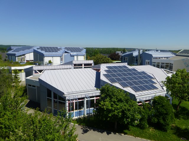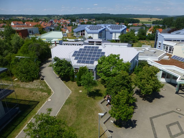 Auf dem Eingangsbereich unserer Schule befindet sich seit einigen Jahren eine kleine Photovoltaik-Anlage, die mit Hilfe von Siliziumzellen Sonnenlicht in Strom umwandelt. Im Oktober 2004 war es nach über zweijährigen Bemühungen endlich soweit, dass eine größere Anlage mit 17,2 kW auf den Dächern des Erweiterungsbaus installiert wurde.