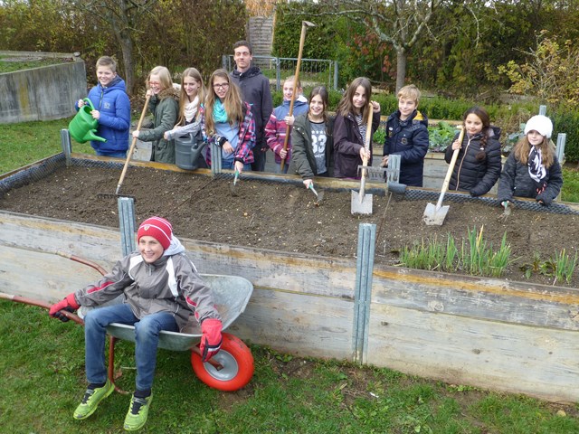 Die Kommission der Schulgarteninitiative, die den Schulgarten im Sommer begutachtet hatte, war sehr beeindruckt. Der bereits vor rund 20 Jahren angelegte Schulgarten wurde immer wieder erweitert und an neue Gegebenheiten und Wünsche angepasst. Die Bezeichnung „Schule im Grünen“ bezieht sich demnach nicht nur auf die wunderschöne Lage inmitten von Feldern und Wiesen, sondern auch auf die naturnahe Gestaltung des Schulgeländes. Zuletzt wurden das Gewächshaus erneuert, die Hochbeete erweitert und in einem Großprojekt eine Bewegungsinsel gebaut. Auch eine Kräuterspirale wurde angelegt, die Wallhecke und das Biotop wurden gepflegt.