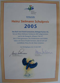 Im Schuljahr 2004/05 konnte die Garten-AG nicht im Schulgarten arbeiten, da der Mensatrakt der Schule gebaut wurde. Deshalb wich die Garten-AG auf Arbeiten an der Wallhecke und am Biotop aus und nahm am ausgeschriebenen Wettbewerb teil, um ein attraktives Ziel zu haben. Dabei waren zwölf Schüler aus der Garten-AG in zwei Gruppen aufgeteilt und arbeiteten selbstständig. Eine Gruppe erforschte regelmäßig eine Hecke, die andere den Schulteich. Beide Gruppen dokumentierten ihre Ergebnisse am zehnten Karl-von-Frisch-Tag am 22.11.2004 in Form einer Ausstellung. Für diese Arbeit wurde dem Karl-von-Frisch-Gymnasium der Heinz-Sielmann-Schulpreis 2005 verliehen. Der Preis umfasste eine Urkunde und ein Fernglas.