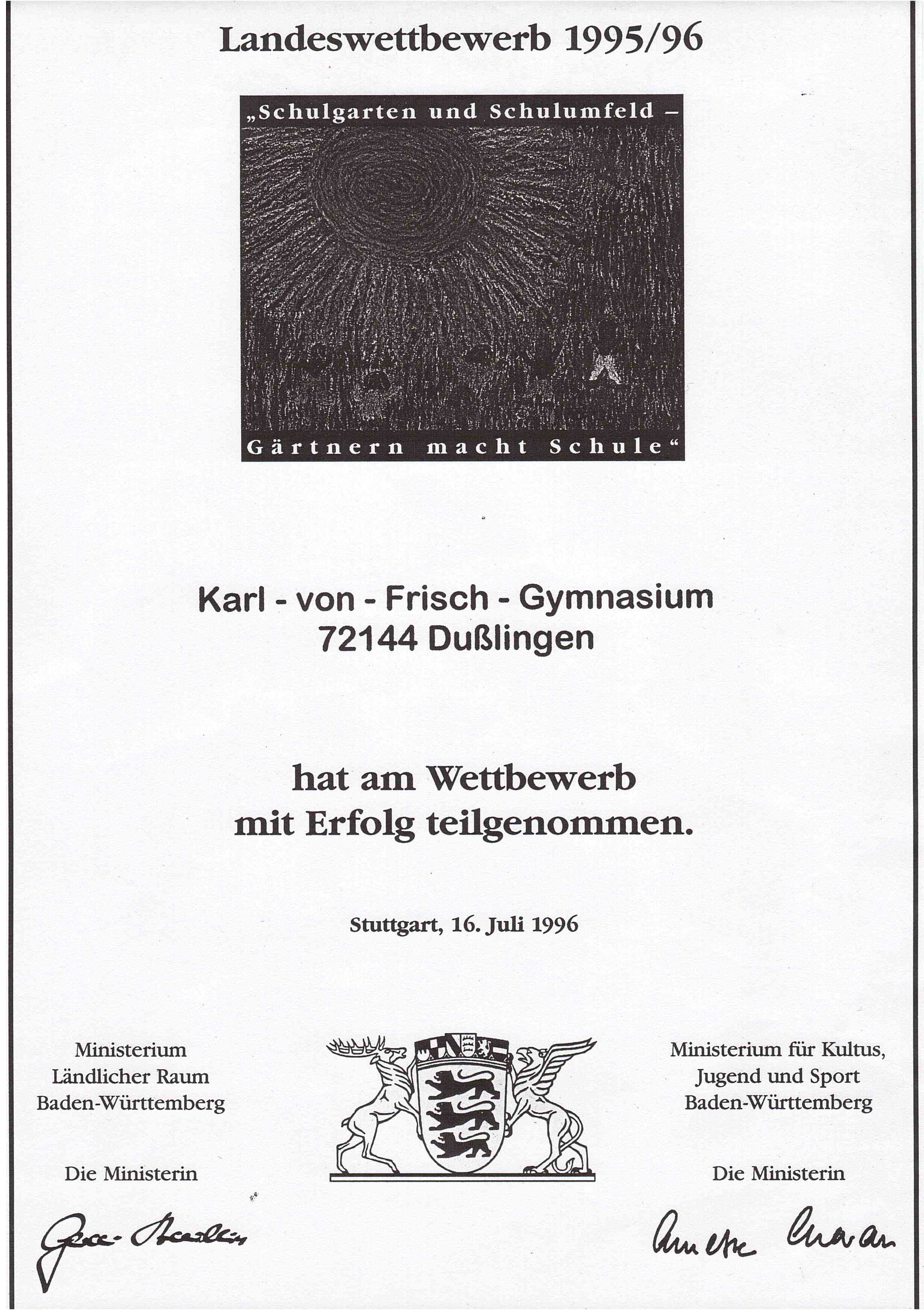 Beim Landeswettbewerb 1995/96 „Schulgarten und Schulumfeld - Gärtnern macht Schule“ wurde mit Erfolg teilgenommen. Die Auszeichnung wurde vor allem für die Konzeption sowie die Anlage des Schulgeländes und des Schulgartens vergeben. Sie bestand aus einer Urkunde und einer Keramik-Kachel (sie hängt im Gang vor dem Raum Bio1).