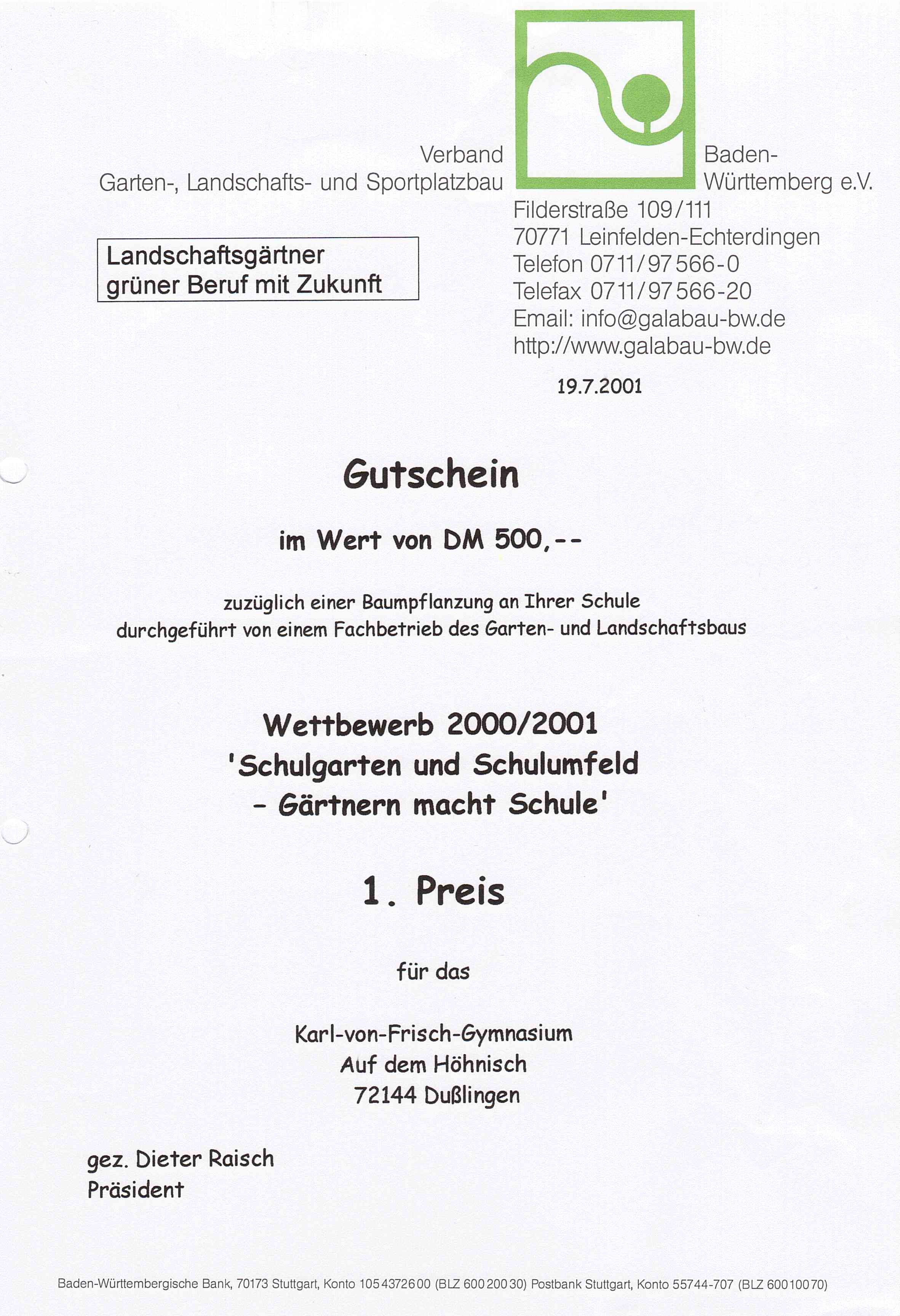 Der Preis wurde für die Weiterentwicklung des Schulgartens und des Schulumfeldes, bei der viele Fachbereiche mitgemacht haben, vergeben. Da dieser erste Preis etwas ganz Besonderes ist, kann er als Höhepunkt der Auszeichnungen des KvFG-Schulgartens bezeichnet werden. Die Preisverleihung fand am 19.7.2001 in Pfullendorf statt.