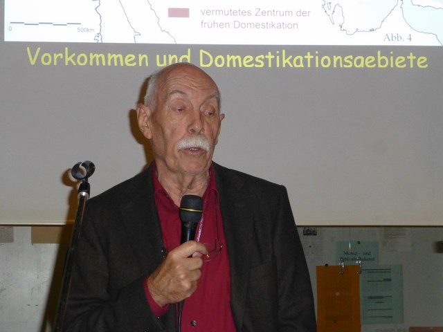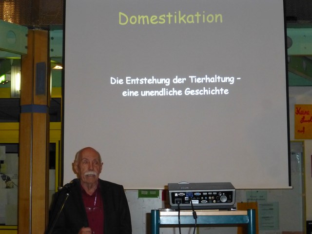 wurde gleich zu Beginn klar, wie „epochal“ das Thema des diesjährigen Vortrags zum Geburtstag unseres Schulnamensgebers war. Prof. Uerpmann von der Abteilung für Archäozoologie des „Instituts für Ur- und Frühgeschichte und Archäologie des Mittelalters“ der Universität Tübingen zeigte sich als promovierter Tiermediziner und Ur- und Frühgeschichtler als erwiesener Experte, zumal die Frage der Domestikation sein Hauptforschungsthema ist.