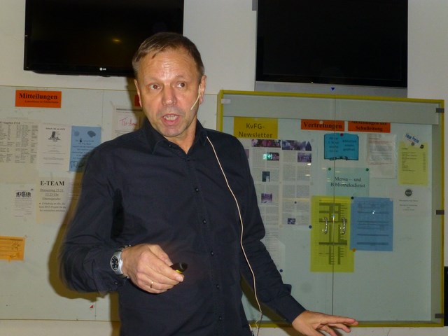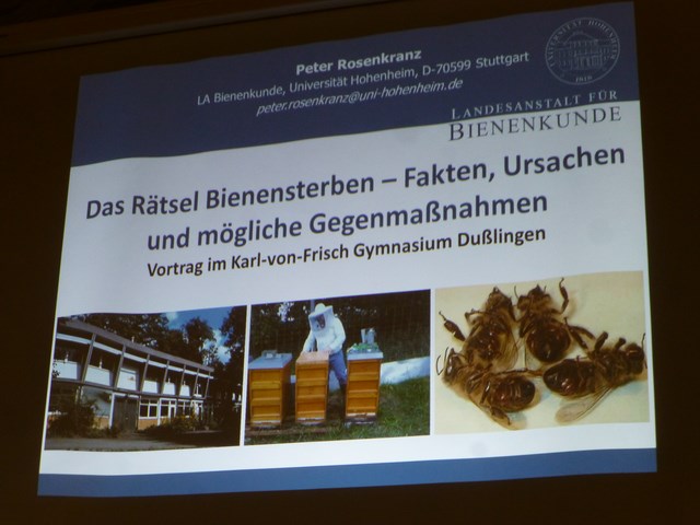 In diesem Jahr war PD Dr. Peter Rosenkranz von der Landesanstalt für Bienenforschung, die an der Universität Hohenheim beheimatet ist, am KvFG zu Gast. Er sprach zu einem zu Karl von Frisch bestens passenden Thema: „Das Rätsel Bienensterben – Fakten, Ursachen und mögliche Gegenmaßnahmen“. Herr Rosenkranz hob gleich zu Beginn darauf ab, dass er nicht nur von Berufs wegen mit Bienen zu tun habe, sondern selbst auch ein aktiver Imker sei. Bei dieser Gelegenheit begrüßte er sogleich mehrere ihm bekannte Imker im Publikum in der sehr gut besuchten KvFG-Aula.