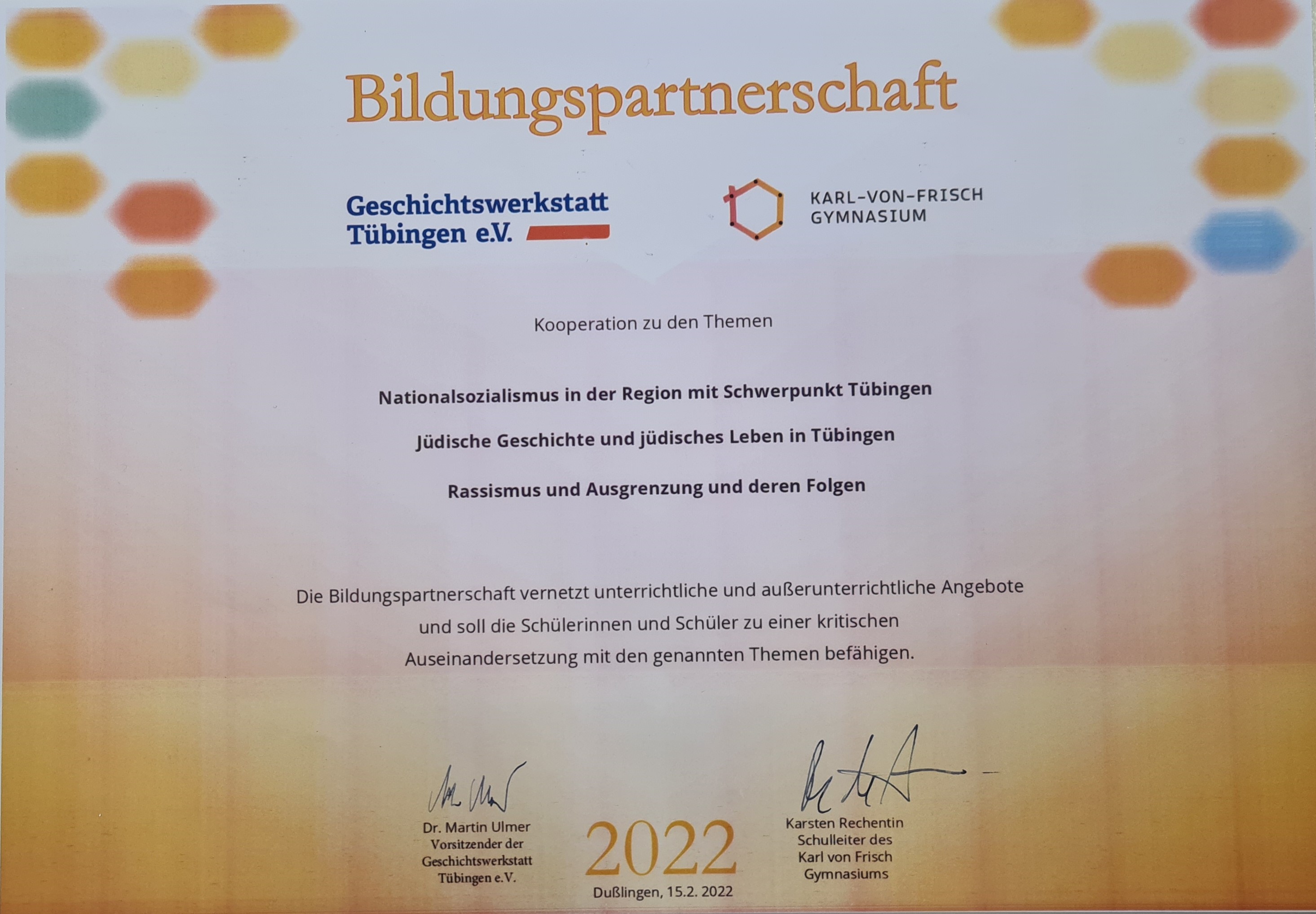 Seit 2022 hat das Karl-von-Frisch-Gymnasium eine Bildungspartnerschaft mit der Geschichtswerkstatt Tübingen. Im Rahmen dieser Bildungspartnerschaft mit den Themenschwerpunkten „Nationalsozialismus in der Region mit Schwerpunkt Tübingen“, „Jüdische Geschichte und jüdisches Leben in Tübingen“ sowie „Rassismus und Ausgrenzung und deren Folgen“ finden in verschiedenen Jahrgängen außerunterrichtliche Angebote wie Exkursionen und Vorträge statt. Auch die Tübinger Jugendguides des Landratsamts werden hier immer wieder mit einbezogen. Der Fachbereich Geschichte versucht auch auf aktuelle Ereignisse einzugehen. Dazu laden wir gerne Experten ein. So hielt der Osteuropaexperte Prof. Klaus Gestwa für unsere Oberstufenschüler einen Vortrag zum Ukrainekrieg.