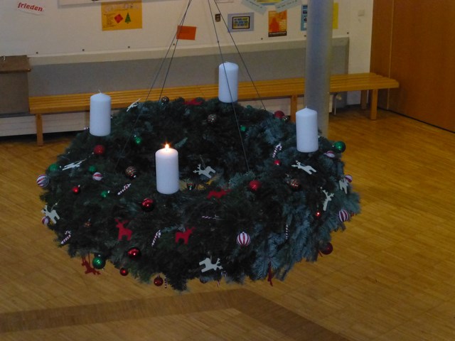 Ein großer Adventskranz ziert wieder die Aula des Karl-von-Frisch-Gymnasiums. Der Kranz wurde durch Kolleginnen und Kollegen am Freitagabend gebunden und aufgehängt. Heute, am 4.12.2023, brannte dann die erste Kerze zum ersten Mal. Der Beginn des Morgens wurde umrahmt durch eine Adventsandacht, die Anke Lohrberg-Pukrop gestaltete und dabei überlegte, wie kenianische Kinder in Kisumu Weihnachten feiern. Über den Verein UHURU e.V. sind wir als Schule seit Jahren mit den sozialen Aktivitäten in den Slums von Kisumu verbunden.