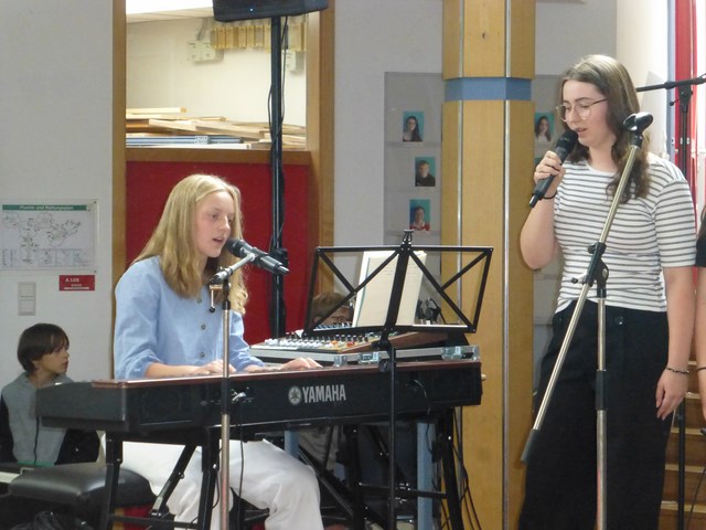 Das vom Elternbeirat organisierte Schulfest bestand wieder aus mehreren Komponenten: natürlich gab es reichhaltige Verpflegung, die von vielen Eltern gespendet wurde. Daneben fand ein buntes Programm statt. Den Auftakt machten Emma Pastink und Jil Bopp aus Klasse 9b, die ein selbst geschriebenes Lied („Who am I“) aufführten. Ausgezeichnet wurden im Anschluss alle Schülerinnen und Schüler, die im Zeugnis einen Schnitt von 1,0 bis 1,2 erreichten. Sie erhielten allesamt eine Urkunde samt Büchergutschein. In verschiedenen Räumen fanden alsdann Präsentationen von Schullandheimaufenthalten oder Klassenfahrten statt (Blaubeuren, Walchensee, Amrum, Douvres-la-Délivrande, London). Zudem gab es eine Kunst-Ausstellung und die Vorstellung von NWT-Facharbeiten. Im Anschluss spielte in der Aula eine halbe Stunde lang die Lehrerband auf, bevor die 60-köpfige Bigband mit einem fulminanten Auftritt ihr Jahresprogramm präsentierte. Allen Eltern und allen am Programm Mitwirkenden ein herzlicher Dank für diese schöne Veranstaltung zum Schuljahresabschluss! Das Schulfest am vorletzten Schultag ist ein Anziehungspunkt, was auch die vielen Besuche ehemaliger Schülerinnen und Schüler belegen.