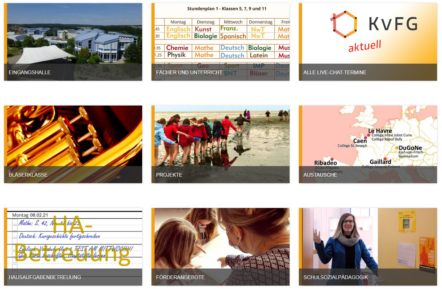 Es gibt auch verschiedene Live-Chats, in die Sie sich einloggen können. Hier erhalten Sie weitere Informationen zum Beispiel über die Profile des Gymnasiums, die Hausaufgabenbetreuung oder unsere Projekte. Natürlich haben Sie auch die Möglichkeit, Fragen zu stellen.