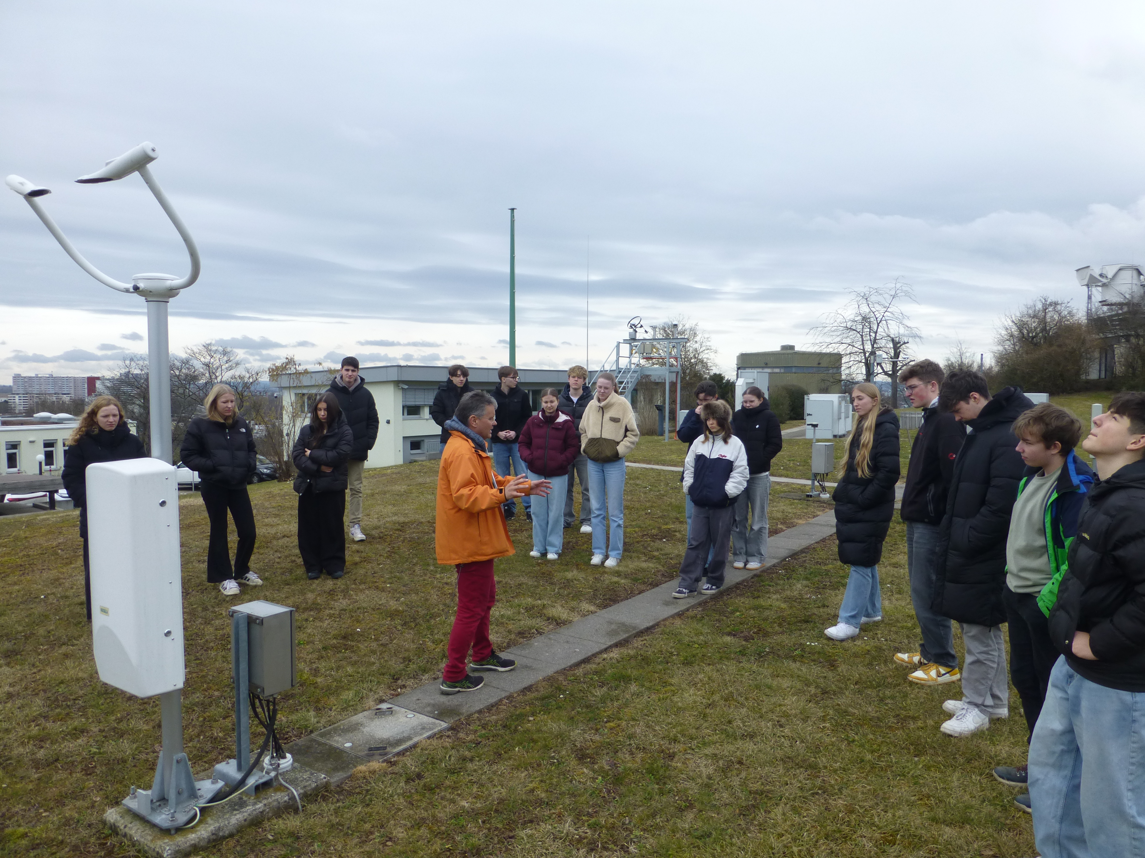 Am Dienstag vor den Faschingsferien sind wir, der Geo-LK der Jahrgangsstufe 1, zum Deutschen Wetterdienst (DWD) nach Stuttgart auf den Schnarrenberg gefahren. Herr Steiner, ein Mitarbeiter des DWD und verantwortlich für die Öffentlichkeitsarbeit, hat uns zuerst einen Vortrag über Aerologie (Höhenwetterkunde) gehalten, der thematisch an unseren Unterricht anknüpfte. Danach sind wir in das Großraumbüro der Station gegangen und konnten die tägliche Arbeit der MitarbeiterInnen des DWD verfolgen und miterleben. Dort prognostizierte ein Mitarbeiter, dass es in zwei Stunden regnen wird. Anschließend besuchten wir den Klimagarten mit vielfältigen, vollautomatischen Messgeräten, die essenziell und grundlegend für die Arbeit des DWD sind, und konnten sogar den Aufstieg eines Wetterballons beobachten. Danach schloss sich eine Analyse von Satellitenbildern an und es folgte noch ein Vortrag zum Klimawandel. Als wir zufällig während des Vortrags um 13 Uhr aus dem Fenster schauten, merkten wir, dass sich die zuvor im Großraumbüro getätigte Niederschlagsprognose fast minutengenau bestätigt hatte. Es war insgesamt ein sehr informativer Tag. Wir bedanken uns bei den Mitarbeitern des DWD für die besonderen Einblicke und bei Herrn Friederichs für die Organisation der Exkursion!