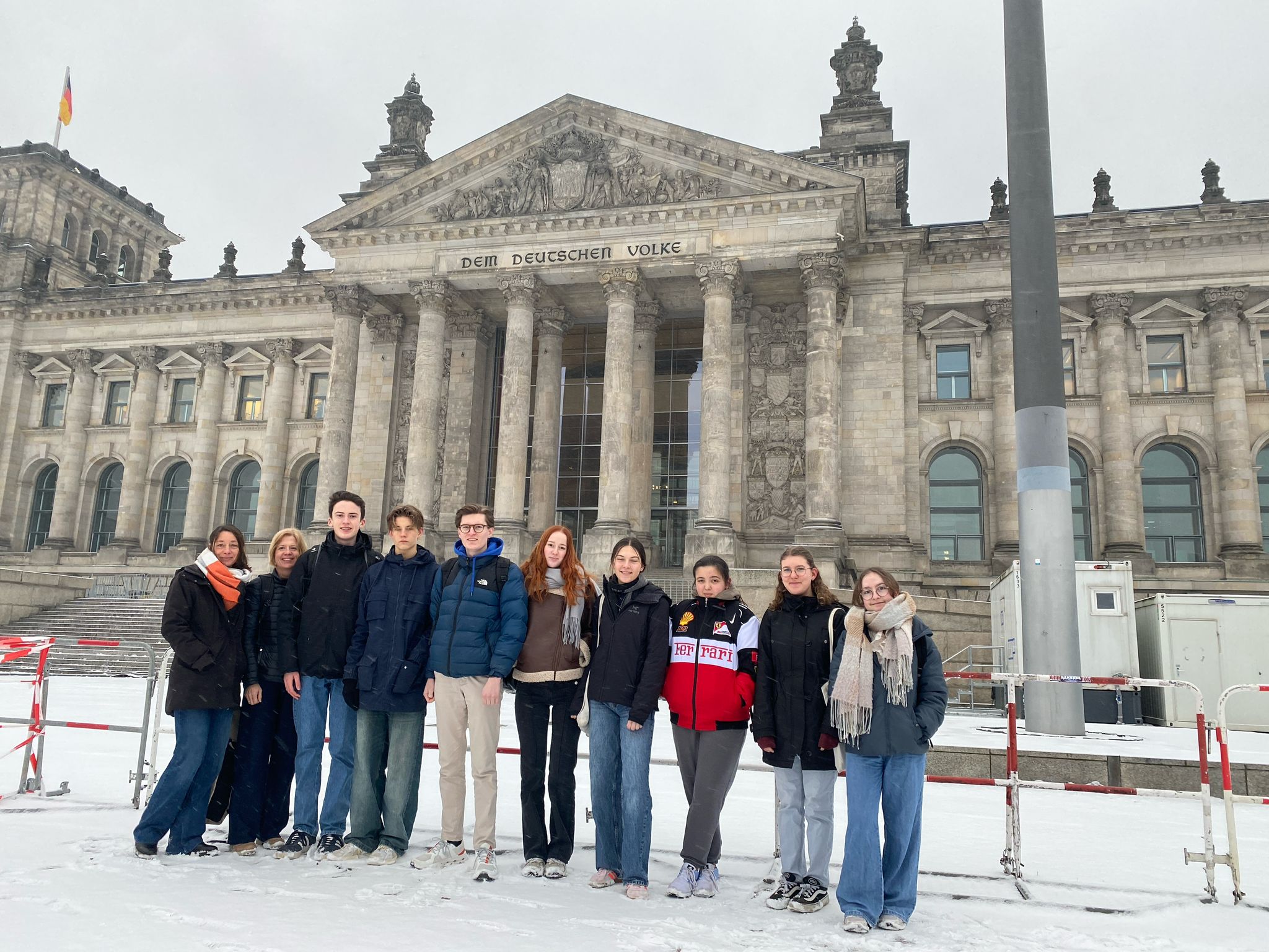 Bei der Studienfahrt des Leistungsfachs Gemeinschaftskunde der Jahrgangsstufe 1 vom 11.-14.2.2025 zeigte sich die Bundeshauptstadt Berlin von ihrer winterlichen Seite. Bei eisigen Temperaturen und wildem Schneetreiben erkundeten die Schülerinnen und Schüler das politische Zentrum unseres Landes. Neben dem Besuch des Stasi-Museums, der Bernauer Straße, des Bundestags und des Bundesrats bildete der Besuch des Kanzleramts das Highlight unserer Studienfahrt. Bei einer abendlichen Führung durch das Kanzleramt kamen wir Olaf Scholz ganz nahe. Er war in seinem Büro im 7. Stock, während wir, stets begleitet von Beamten der Bundespolizei, die anderen Stockwerke besichtigen durften.