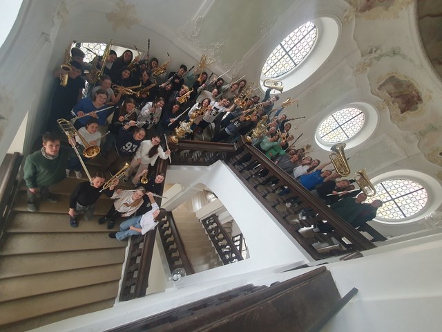 Die 60 Bläserinnen und Bläser der Juniorbigband und Bigband verbrachten drei produktive Tage in der Landesakademie für Musik in Ochsenhausen gemeinsam mit Frau Braun und Herr Wolf. Hier konnten sich alle dem Glanz eines barocken Klosters hingeben. Große helle Räume, lange Marmorflure, pausbackige Engelchen als Stuck an den Decken - beste Voraussetzungen für eine gelingende Musikfreizeit. Vom Erfolg der Freizeit können Sie sich selbst beim KvFG-Bläserkonzert am Donnerstag, 30.3.2023 um 19 Uhr im Foyer des Karl-von-Frisch-Gymnasiums überzeugen. Herzliche Einladung dazu!