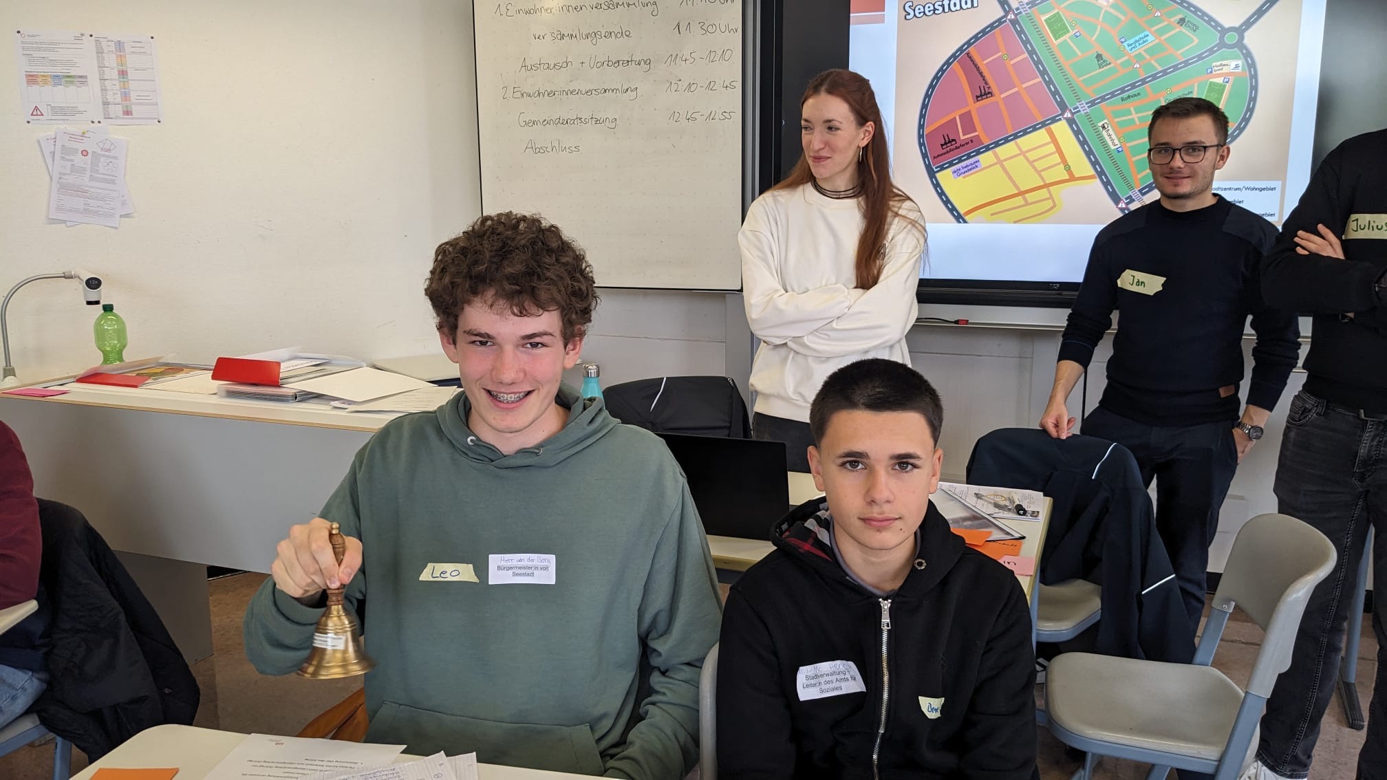 Im Planspiel „Flüchtlinge Willkommen?“ setzten sich die Klasse 9c mit der Integration von Geflüchteten in der fiktiven Gemeinde Seestadt auseinander. Unter Anleitung von Teamer:innen der Landeszentrale für politische Bildung übernahmen die Schüler:innen Rollen von Gemeinderät:innen, Vereinsmitgliedern, Bürgermeister:innen und weiteren Akteur:innen. In simulierten Einwohnerversammlungen und einer Gemeinderatssitzung diskutierten die Schülerinnen und Schüler lebhaft, wie und wo Geflüchtete untergebracht werden sollen und wie Integration gelingen kann. Am Ende entschied der Gemeinderat für dezentrale Unterkünfte, einen Flüchtlingsrat, Möbelspenden und ermäßigte Beiträge in den Vereinen. Das Planspiel verdeutlichte, wie komplex kommunale Entscheidungsprozesse sind und wie wichtig Kooperationen sind, um Mehrheiten zu bilden und praktikable Lösungen für gesellschaftliche Herausforderungen zu finden. - Bärbel Norz