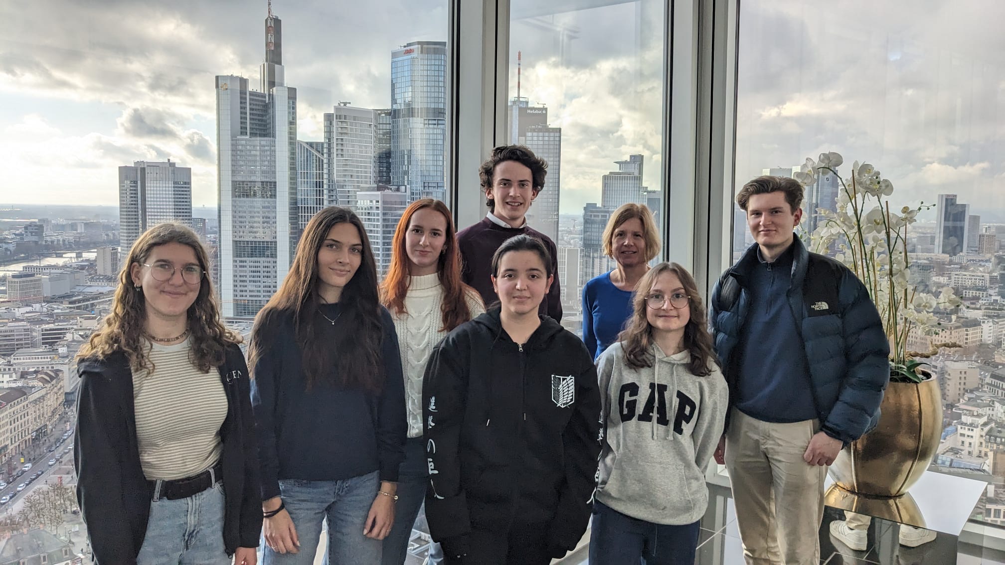Einen Einblick in das Finanzzentrum unseres Landes erhielten die Schüler:innen des Leistungsfachs Gemeinschaftskunde der Jahrgangsstufe 2 bei einer Exkursion nach Frankfurt am Main am 15.01.2026. Organisiert wurde diese von einem Schüler des Kurses, der vor Ort seine GFS zum Verhältnis der Europäischen Zentralbank (EZB) zur amerikanischen Zentralbank FED hielt. Nach einer kurzen, aber sehr informativen englischsprachigen Führung durch die Ausstellung der Europäischen Zentralbank genossen wir im 23. Stockwerk des Nextowers die beeindruckende Aussicht über Frankfurt und hörten Jakobs GFS. Nach einem gemeinsamen Mittagessen besuchten wir die Ausstellung der Frankfurter Börse sowie die Zuschauertribüne mit Blick auf den Handelsplatz. Eine freundliche Mitarbeiterin beantwortete unsere Fragen rund um Börse und Aktienhandel. Ein kurzer Spaziergang durch das Finanzviertel bildete den Abschluss der Exkursion, bevor wir erschöpft, aber mit vielen neuen Eindrücken, die Heimreise antraten.