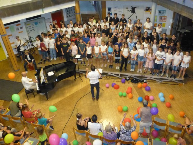 Fetzige Stücke verschiedener Genres erklangen beim Sommerkonzert am 11.7.2023 in der KvFG-Aula. 30 Schülerinnen und Schüler der beiden Schul-Bands von Frau Heutjer musizierten gut ausbalanciert bekannte Rocksongs, die Klassen 5a und 5b traten in einem großen Fünferchor auf und die Klasse 6b führte passend zu den heißen Wetterbedingungen einen Klima-Protestsong auf - unterstützt durch selbst hergestellte Plakate. Zum von Herrn Wolf eigens fürs Konzert einberufenen Schüler-Eltern-Lehrer-Projektchor haben sich 40 Singbegeisterte zusammengefunden und zu guter Letzt sangen noch 30 Schülerinnen und Schüler des Schulchors verschiedene Lieder, vor allem aus der Popliteratur. Zum allerletzten Stück, das alle Sängerinnen und Sänger des Abends gemeinsam präsentierten (99 Luftballons), fielen diese tatsächlich von der Balustrade der Aula und transportierten das Stück auf besondere Art und Weise in den Zuschauerraum. Wir danken allen, die sich beim Konzert so wundervoll eingebracht haben!