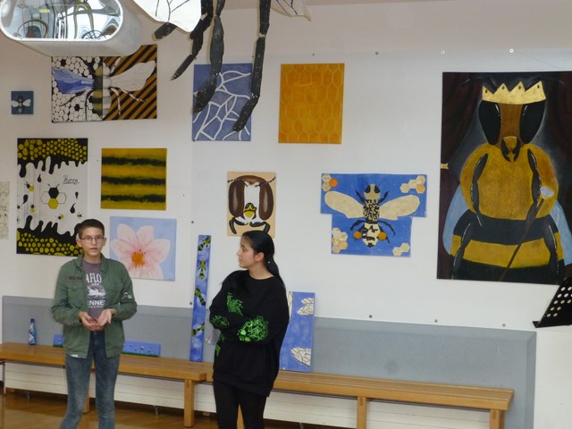 Eine Gruppe von Neuntklässlern befasste sich in der Projektphase vor den Herbstferien mit Bienen-Kunst. In einer Vernissage am letzten Projekttag präsentierten zwei Schülerinnen zwei große Pappmaschee-Bienen sowie mehrere Gemälde auf Leinwand in unterschiedlichen Formaten. Besonders ins Auge sticht eine beeindruckende Bienenkönigin mit Krone. Umrahmt wurde die Vernissage von einem Querflötenduett, das unter Begleitung von Frau Braun Sätze von J. S. Bach spielte, sowie Getränken und Honigbroten zum anschließenden Verspeisen.