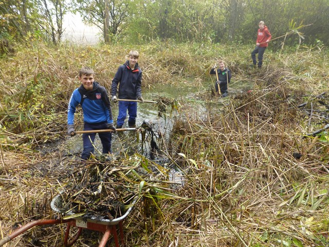In den drei Tagen vor den Herbstferien haben sich über 60 Neuntklässlerinnen und Neuntklässler im Gartenprojekt engagiert. Der Schulgarten wurde in verschiedenen Teilbereichen einer Pflegeaktion unterzogen. So wurde der Vorgarten auf Vordermann gebracht und das Biotop wurde einer Generalüberholung unterzogen. Leider mussten wir feststellen, dass der vordere Flachwasserteichbereich komplett verlandet war. In sehr engagierter Arbeit sorgten viele Neuntklässlerinnen und Neuntklässler dafür, dass große Wurzelteppiche samt Wurzelstöcken entfernt werden konnten, damit der Zulauf von Frischwasser wieder bis zum hinteren, tiefen Teichbereich möglich wird. Mit dem grünen Klassenzimmer wurde an einer dritten Stelle im Schulgarten fleißig gewerkelt. Unser „Holzteam“ hat sich handwerklich an der Erneuerung der teilweise vermoderten Holzbohlen der Terrasse samt Unterkonstruktion verdient gemacht. Wir danken den beteiligten Neuntklässlern für deren ausdauernden und umfassenden Einsatz für die notwendigen Pflegearbeiten an wichtigen Bereichen unseres Schulgartens!