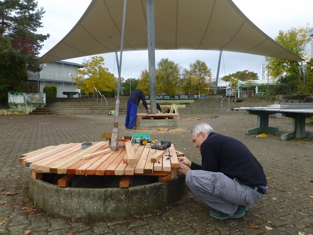 Die Schülerinnen und Schüler wünschten sich immer wieder mehr Sitzgelegenheiten auf dem Schulhof. Im letzten Jahr haben wir im Zuge des Kurzprojekts mit Hilfe einiger Neuntklässler damit begonnen, die Betonringe, in denen das Sonnensegel abgespannt ist, mit Holzauflagen zu belegen und damit Bänke zu gewinnen. In diesem Jahr wurden zwei weitere Bänke auf den Betonringen auf dem unteren Schulhof errichtet. Herr Ströbele und unser Hausmeister, Herr Kalweit, wären hier tatkräftig im Einsatz. Vielen Dank für die geleistete Arbeit, die zu einem Mehrwert fürs Schulgelände beiträgt! Die Bänke konnten am Freitag, 27.10.2023, fertiggestellt werden und damit auch das im letzten Jahr begonnene Projekt. Die bereits bestehenden Bänke wurden rege angenommen und vermutlich wird das auch bei den neu errichteten Sitzgelegenheiten der Fall sein.