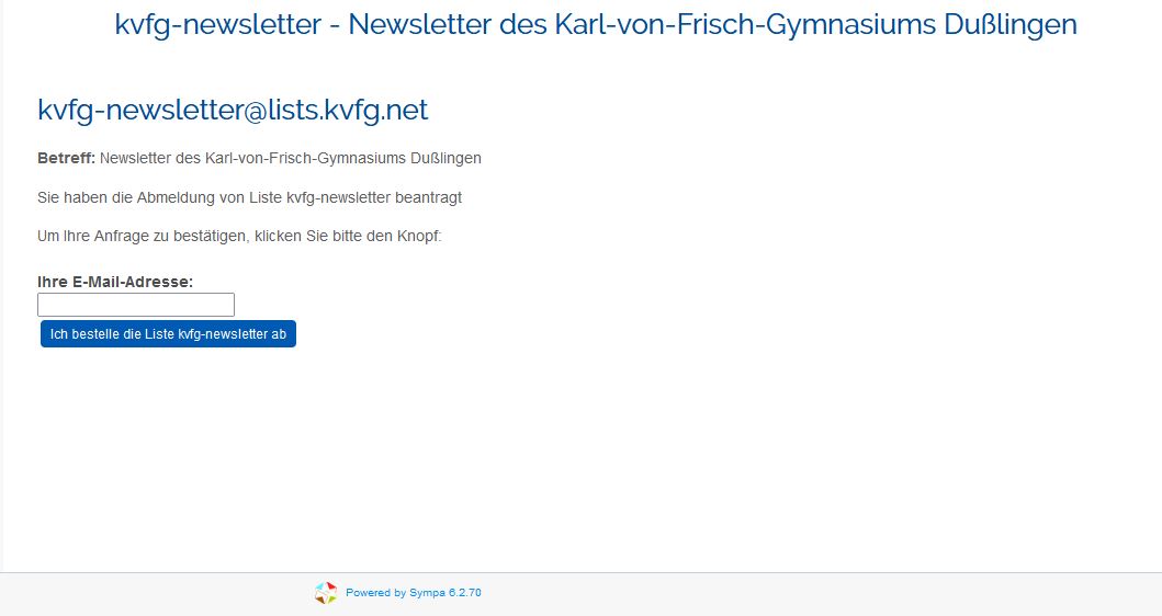 Tragen Sie Ihre E-Mail-Adresse, mit der Sie sich für den Erhalt des KvFG-Newsletters angemeldet hatten, ein und klicken Sie auf „Ich bestelle die Liste kvfg-newsletter ab“.