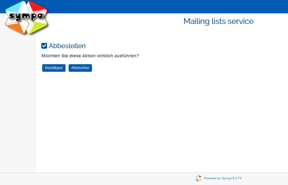 - Bestätigen Sie die Frage „Wollen Sie die Liste kvfg-newsletter wirklich abbestellen?“ durch einen Klick auf „Bestätigen“.