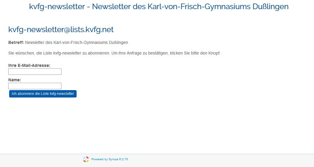 Der KvFG-Newsletter ist der Informationsdienst des Karl-von-Frisch-Gymnasiums. Sie bekommen über diese Mailingliste Einladungen zu aktuellen Veranstaltungen sowie Informationen zu diversen schulischen Themen.