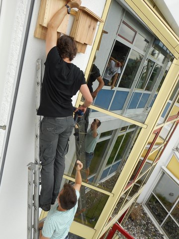 An den E-Days im Herbst 2014, im Herbst 2015 und im Juni 2015 wurden von Schülerinnen und Schülern Fledermaus-Flachkästen aus unbehandeltem Holz abgemessen, zugesägt und montiert und im Juni 2015 am Schulgebäude in katzensicherer Höhe aufgehängt.