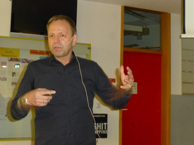 In diesem Jahr war PD Dr. Peter Rosenkranz von der Landesanstalt für Bienenforschung, die an der Universität Hohenheim beheimatet ist, am KvFG zu Gast. Er sprach zu einem zu Karl von Frisch bestens passenden Thema: „Das Rätsel Bienensterben – Fakten, Ursachen und mögliche Gegenmaßnahmen“. Herr Rosenkranz hob gleich zu Beginn darauf ab, dass er nicht nur von Berufs wegen mit Bienen zu tun habe, sondern selbst auch ein aktiver Imker sei. Bei dieser Gelegenheit begrüßte er sogleich mehrere ihm bekannte Imker im Publikum in der sehr gut besuchten KvFG-Aula.