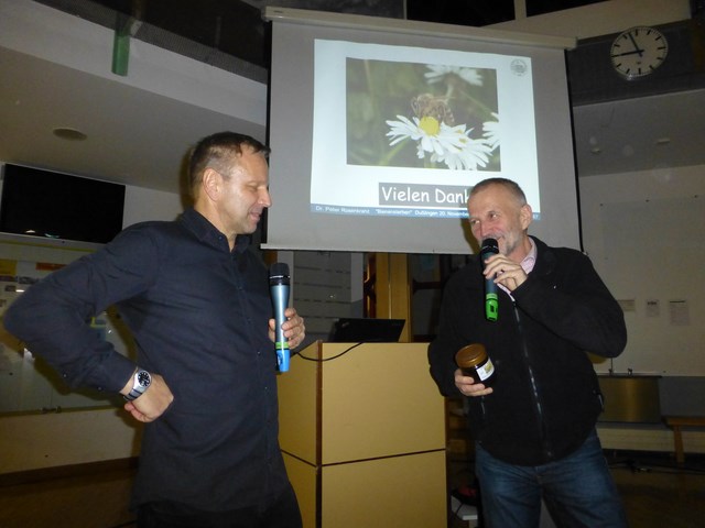Gibt es nun statt dem Bienensterben ein Insektensterben? Feststellbar sei, dass die Biodiversität verlorengehe. Man könne dies festmachen an einem auch in Deutschland spürbaren dramatischen Rückgang wildlebender Bestäuber (u.a. Wildbienen). Als Ursachen sieht Herr Rosenkranz die Landschaftsveränderungen durch den Menschen, die intensive Landnutzung, den Einsatz von Pestiziden oder Lichtfallen. Hingegen nehme die Zahl der Honigbienen zu, solange es Imker gebe.