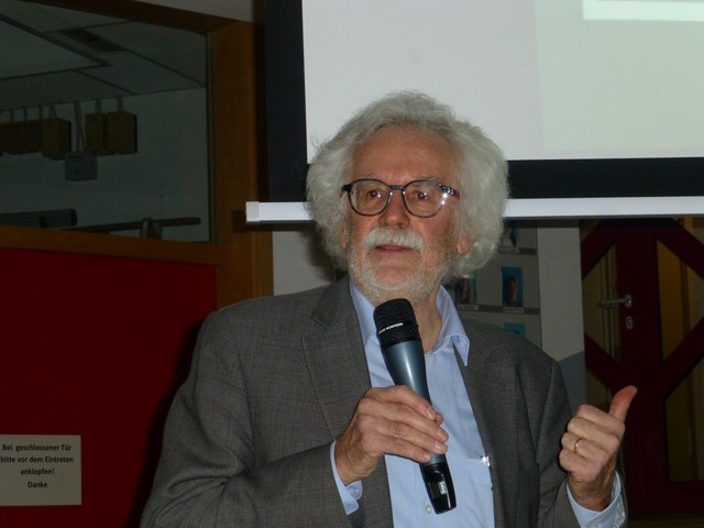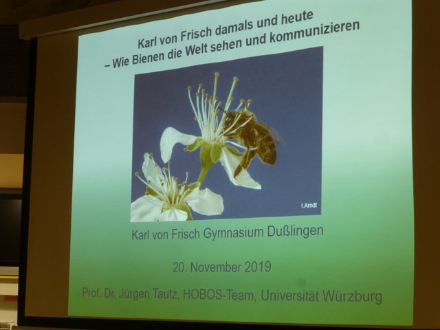 Zum Jubiläum des 25. Karl-von-Frisch-Tags war am 20.11.2019 mit Prof. Jürgen Tautz, bekannter Bienenforscher und Autor, ein besonderer Referent am KvFG. Zum Thema „Karl von Frisch damals und heute - Wie Bienen die Welt sehen und kommunizieren“ nahm er die zahlreichen Zuhörenden in der vollen Aula mit in die Wahrnehmungswelt der Bienen.