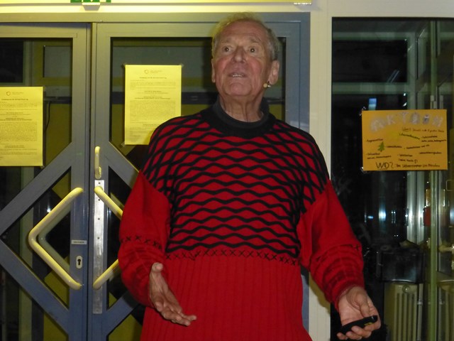 Prof. Wunner erläuterte, dass es ein Grundprinzip der Allgemeinen Relativitätstheorie sei, dass die Materie dem Raum sagt, wie er sich zu krümmen hat; in dieser gekrümmten Geometrie bewegt sich die Materie. Aus der Bewegung der Materie kann man also auf die insgesamt vorhandene Materie und deren Masse zurückschließen.