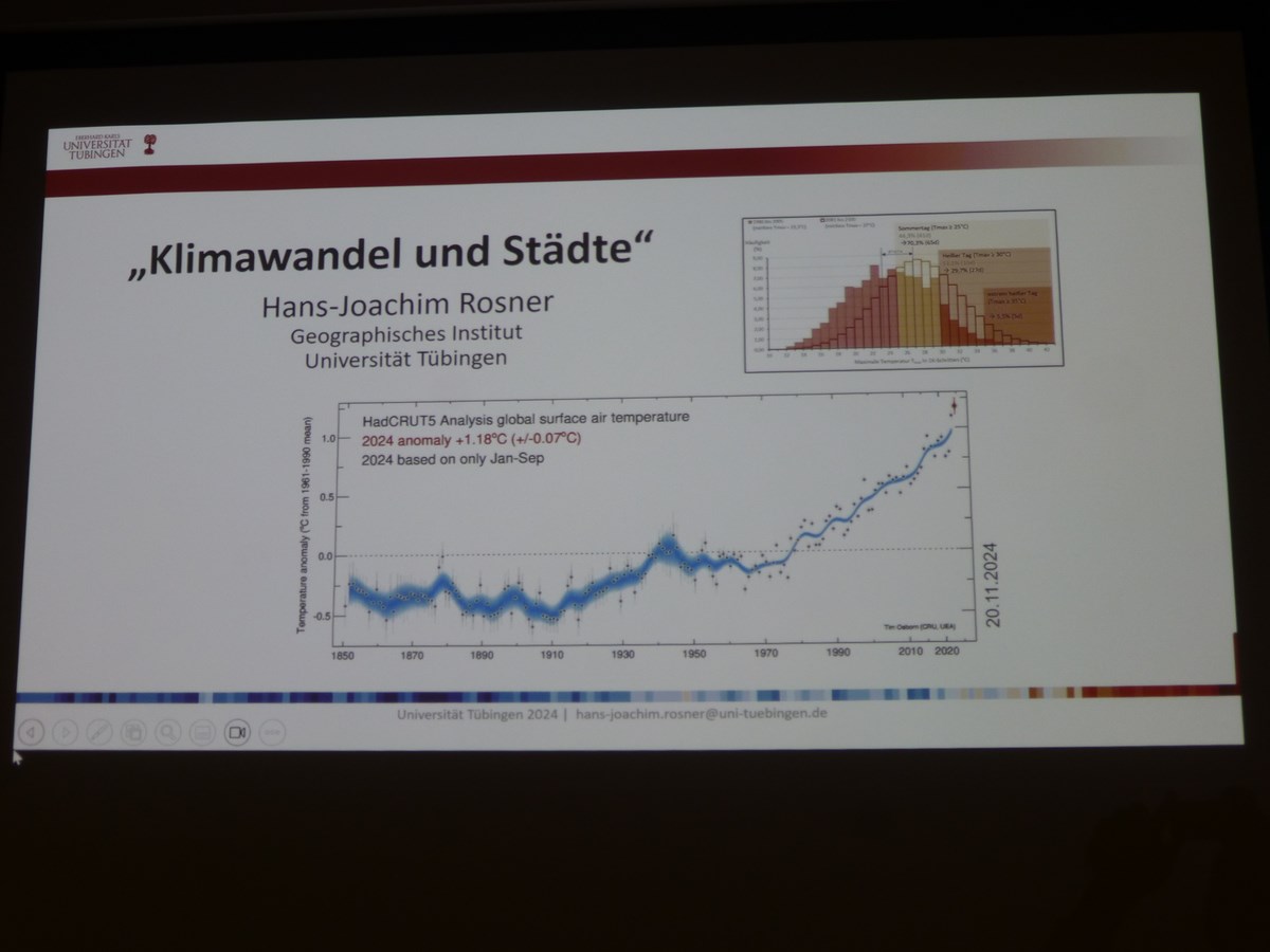 Herr Rosner warf fortan einen Blick auf Klimaschwankungen in der älteren und jüngeren Erdgeschichte: Innerhalb der letzten 400000 Jahre kamen die pleistozänen Kaltzeit-Komplexe vor. Der CO2-Gehalt betrug zu dieser Zeit 200 bis 300 ppm, heute liegt dieser Wert bei 420 ppm. Und dabei gab es Schwankungen, sodass man in der Jüngeren Dryas (10790 bis 9700 vor Chr.) mit einer globalen Durchschnittstemperaturabnahme um 3 bis 4 K von einem Klimapessimum und im Atlantikum (7300 bis 3500 vor Chr.) mit Temperaturen von +1 bis 2 K von einem Klimaoptimum spricht. Im Jahr 2024 (Werte von Januar bis September) kam es zu einem globalen Temperaturanstieg von +1,52 K. In Deutschland ist mit +1,8 K ein linearer Trend zu verzeichnen, der schneller ansteigt als der globale Durchschnitt. In Tübingen betrug die Jahresdurchschnittstemperatur im Mittel der Jahre 1891 bis 1990 8,3 °C und der Niederschlag 759 mm. In der Messperiode von 2010 bis 2023 beträgt die Jahresdurchschnittstemperatur bereits 10,9 °C und der Niederschlag liegt bei 563 mm, was bedeutet, dass es trockener und wärmer wird. Im Vergleich der beiden Messperioden liegt der Temperaturanstieg allerdings schon bei mehr als dem auf der Pariser Klimakonferenz vereinbarten 1,5 °C-Ziel!
