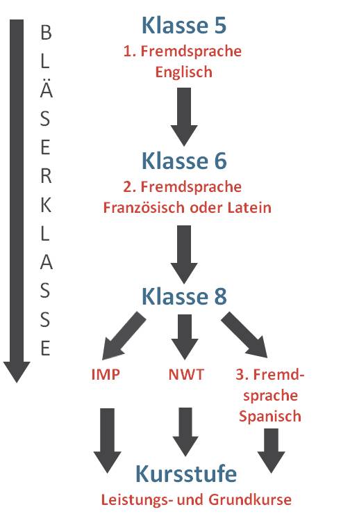 In der 8. Klasse muss man entscheiden, ob man den sprachlichen Zug mit Spanisch als dritter Fremdsprache, das naturwissenschaftliche bzw. technische Fach NWT (Naturwissenschaft und Technik) oder IMP (Informatik, Mathematik, Physik) wählt. Das gewählte Fach ist dann das fünfte Hauptfach.